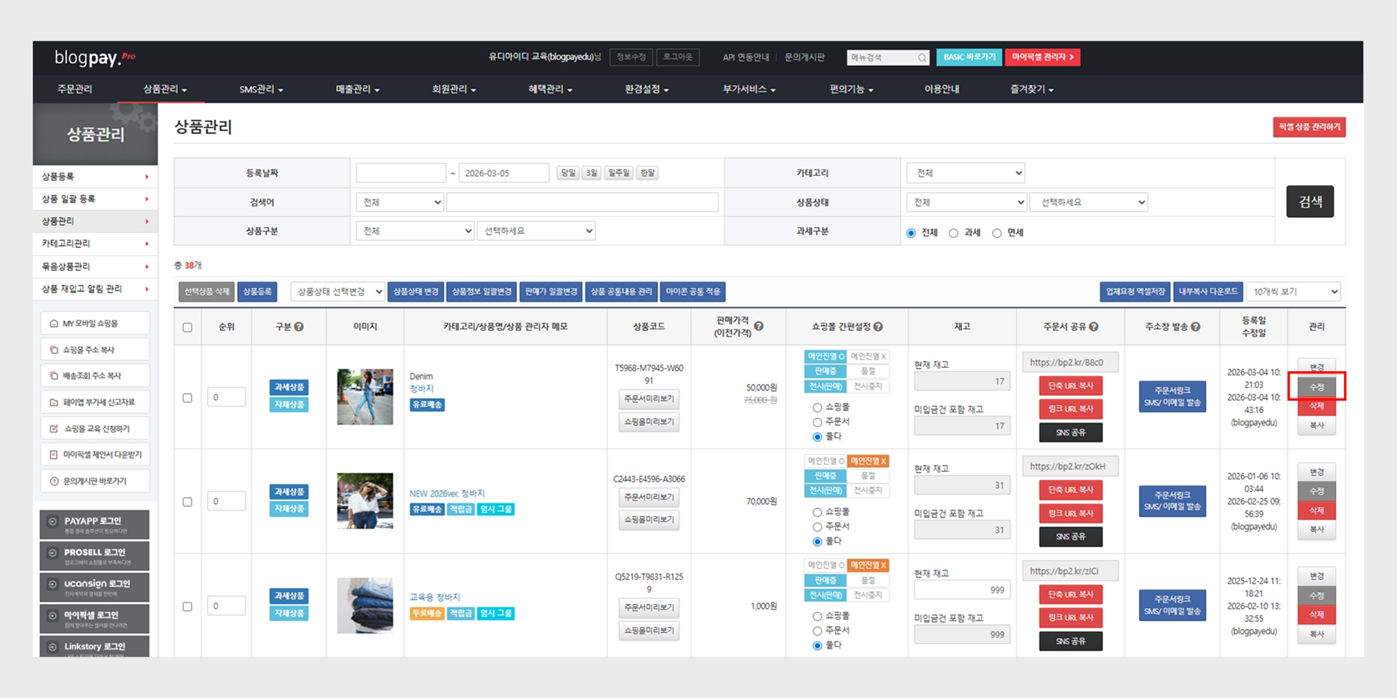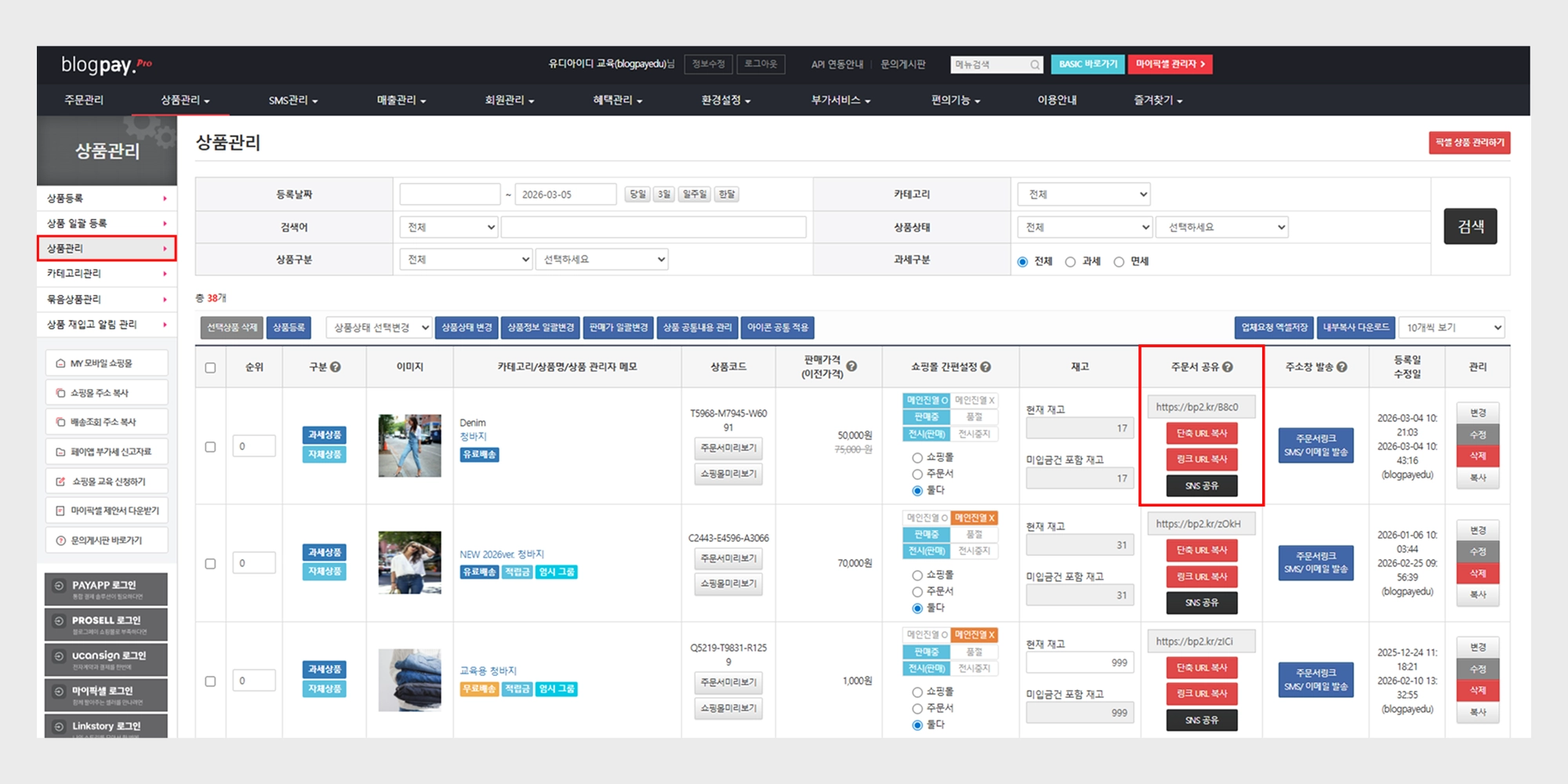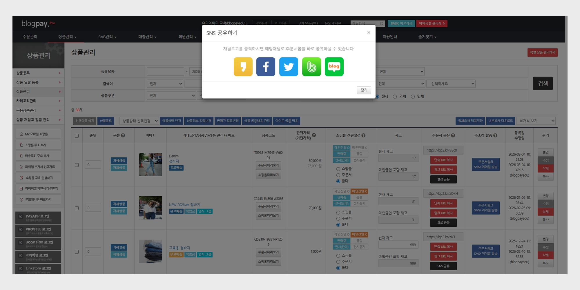 주문서 링크 생성부터 SNS 공유 방법 및 경로 : 상품관리 → 상품관리