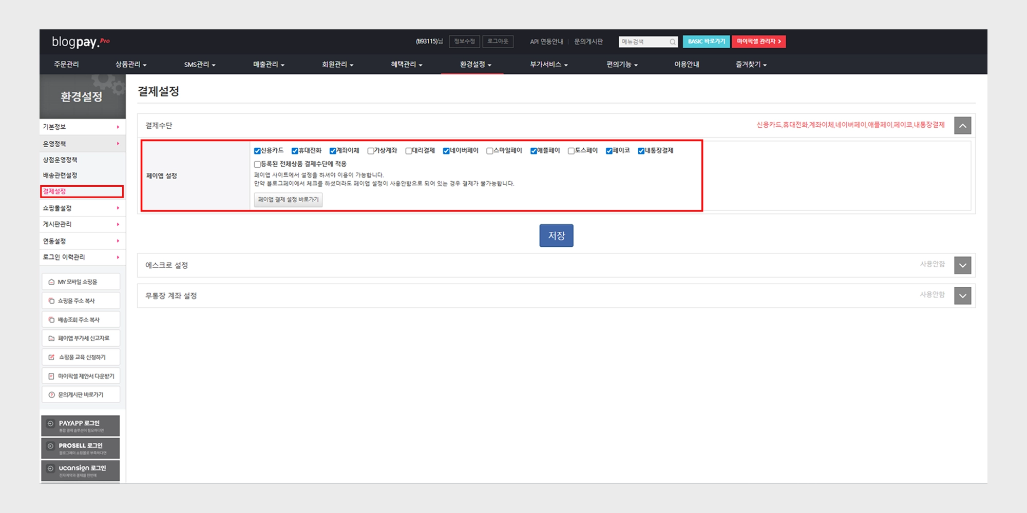 결제 설정 방법 및 경로 : 환경설정 → 운영정책 → 결제설정