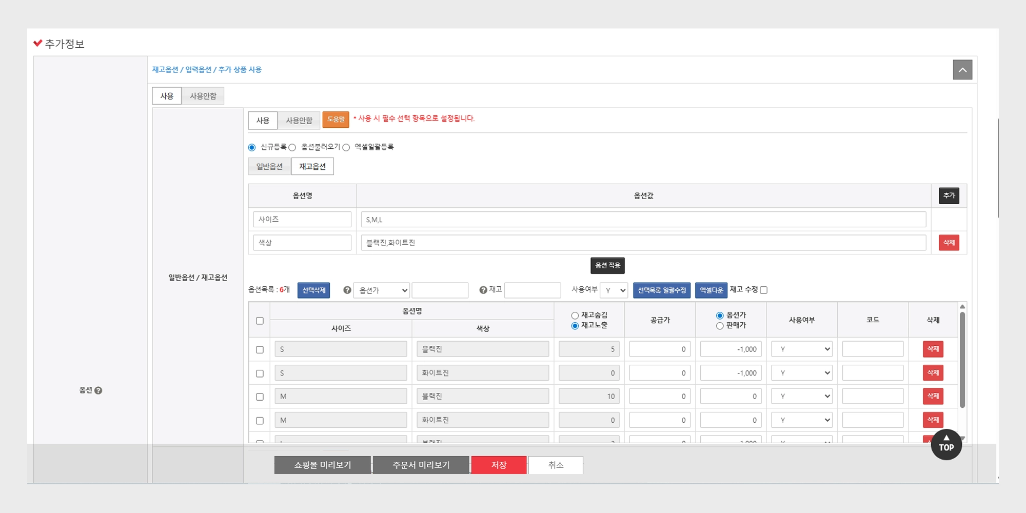 상품 옵션 설정 및 재고관리