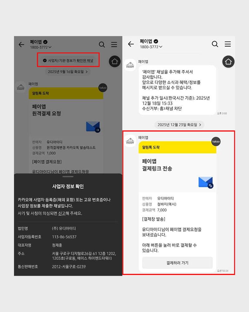 기존 SMS 발송에서 현재는 카카오 알림톡 요청으로 업그레이드 적용되었어요. 고객이 카카오톡을 사용하지 않는 경우에는 문자 메시지(SMS)로 자동 전환되어 발송됩니다. 과거에는 문자 메시지를 통한 피싱 사례가 많아 고객들이 SMS 링크를 선호하지 않는 경우가 있었지만, 페이엡에서 제공하는 알림톡은 카카오톡 [페이앱 공식 채널]을 통해 전달되므로 고객이 안심하고 결제를 진행할 수 있어요.